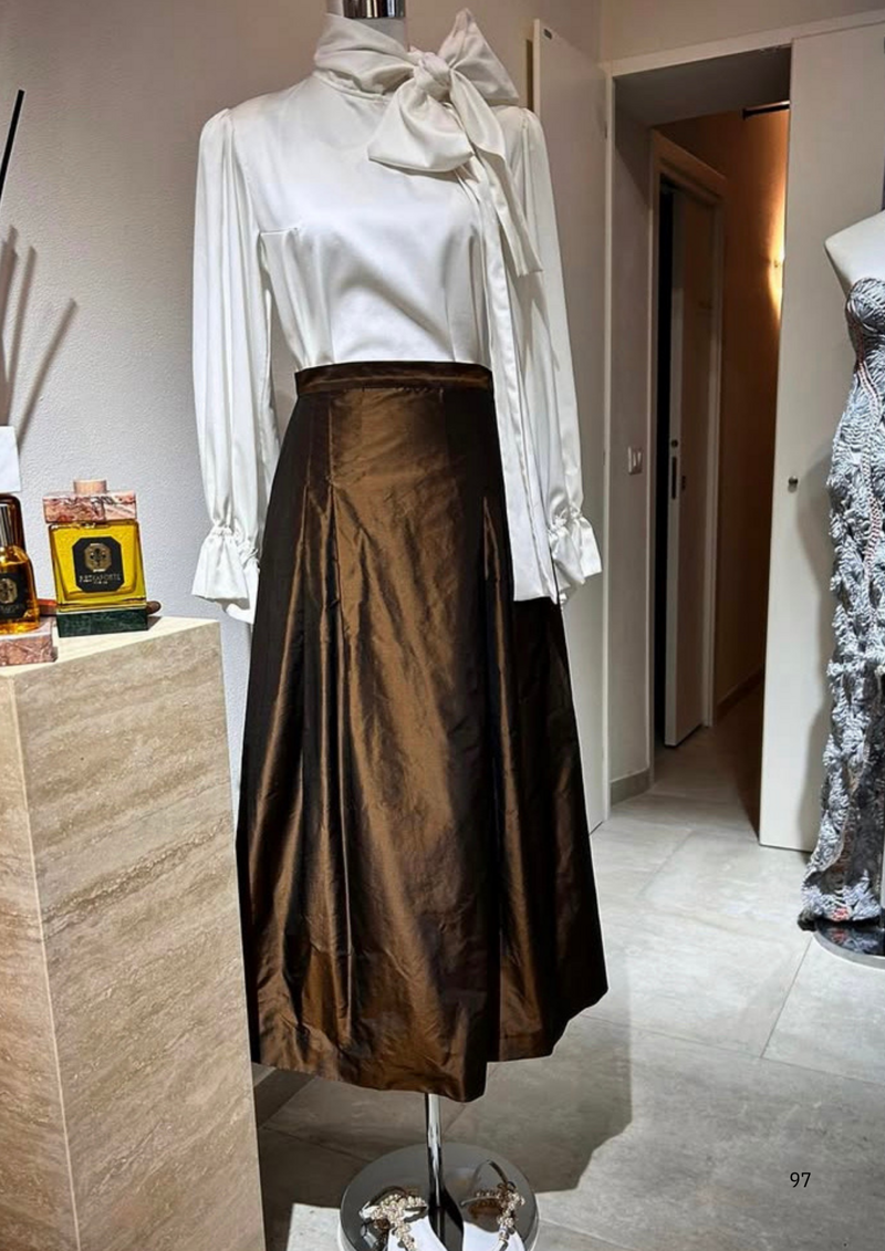 Gonna Campanula lunga le due pieghe morbide sul davanti e sul dietro caratterizzano questa gonna molto femminile . Seta marrone